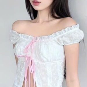Áo ren trễ vai corset nơ hồng